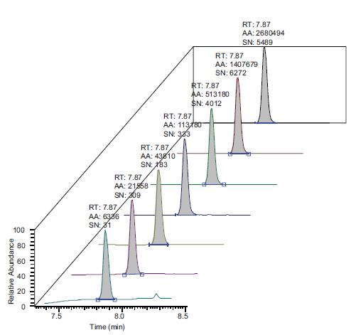 圖 4. NDMA 從1 ppb ( 底部) 至 500 ppb ( 頂部) 的校準(zhǔn)曲線測定結(jié)果