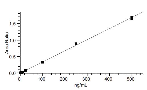 我們在1 ppb 到500 ppb 這一較寬的濃度范圍內(nèi)進(jìn)行了定量校準(zhǔn)。圖4 展示了從所有的校準(zhǔn)檢測中得到的亞硝胺色譜峰。在所有情況下,NDMA 的峰形都是完全對稱的,沒有拖尾,而且無需任何手動(dòng)修正就得到了非?煽康姆迕娣e積分值。圖5 所示為用于樣品定量的NDMA 校準(zhǔn)曲線,曲線R2 大于0.99,可見線性極佳。本TSQ 8000 GCMS/MS 方法對所有亞硝胺都達(dá)到了相同水平的校準(zhǔn)精度。