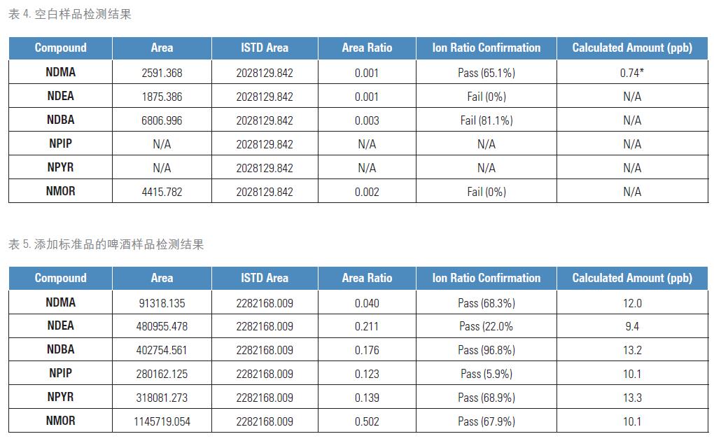 另一個(gè)樣品通過在啤酒中添加不同濃度的亞硝胺制備而成。所有的亞硝胺化合物都被檢出,并在低濃度區(qū)間進(jìn)行了定量,如表5 所示。每個(gè)用于定量的峰都通過了離子比質(zhì)量控制,并且能夠在這樣的低濃度通過計(jì)算離子比對每個(gè)檢測為陽性的化合物進(jìn)行確認(rèn)。