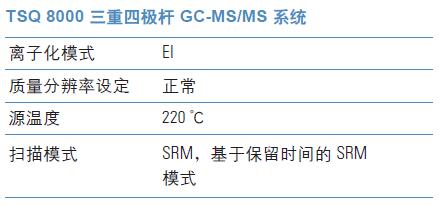 表1 就是由AutoSRM 自動(dòng)生成的SRM 離子對表格。該表同時(shí)還顯示了TSQ8000 GC-MS/MS 在Timed-SRM 模式下、在化合物洗脫時(shí)間左右用一個(gè)60 秒的短采集窗口進(jìn)行采集的SRM 采集方法。無需對掃描時(shí)段進(jìn)行任何其他的設(shè)置,或者說如果需要在某化合物的洗脫時(shí)間之外對其進(jìn)行監(jiān)測,則需要手動(dòng)添加該化合物。
