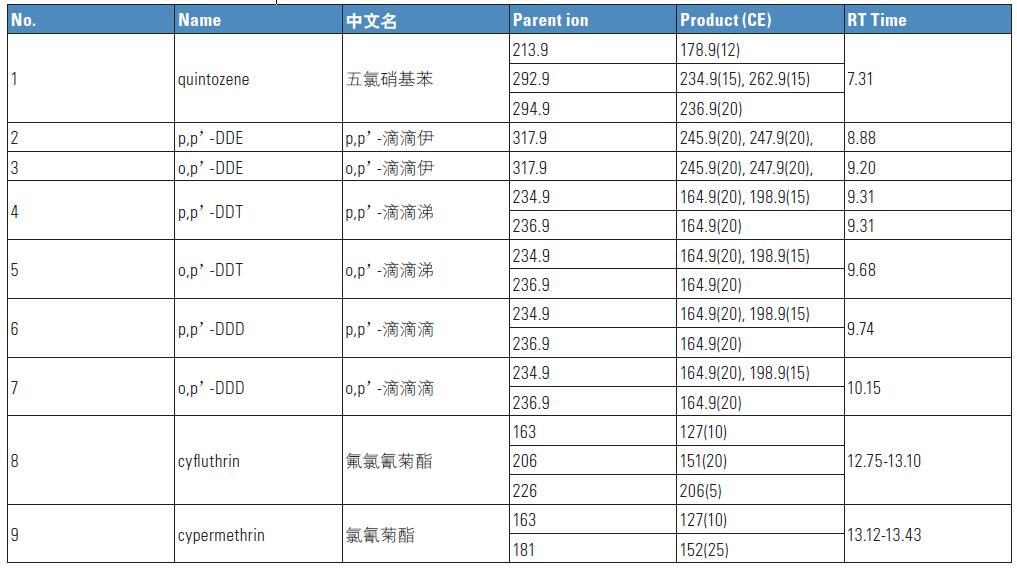 氣相色譜三重四極桿質(zhì)譜TSQ Quantum XLS用于9種有機(jī)氯農(nóng)藥和擬除蟲菊酯類農(nóng)藥的檢測分析