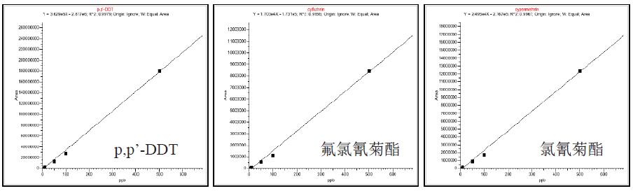 本實驗用TSQ Quantum XLS結(jié)合高惰性的弱極性色譜柱分析有機(jī)氯農(nóng)藥和擬除蟲菊酯類農(nóng)藥,得到了非常出色的結(jié)果;|(zhì)樣品的最低檢測限在0.05-0.5ppb之間,在1ppb-500ppb的范圍有良好的線性,且在基質(zhì)加標(biāo)樣品連續(xù)5針進(jìn)樣的RSD%在1.52%-3.30%。