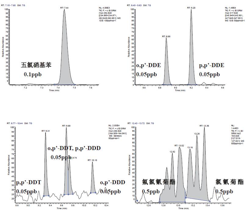 采用逐級稀釋的方法檢測TSQ Quantum XLS的靈敏度,最終檢測出各化合物的最低檢測限如圖2所示。所有的有機(jī)氯農(nóng)藥的最低檢測限在0.05-0.5ppb之間。由于采用5MS色譜柱,o,p’-DDT和 p,p’-DDD未完全分開,但是從結(jié)果看,并不影響最低檢測限處的峰強(qiáng)度。如果需要進(jìn)一步實驗,可以采用1701類中等極性的色譜柱,這兩種化合物可以完全分開