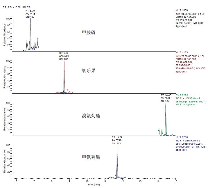 本文應(yīng)用賽默飛世爾科技三重四極桿質(zhì)譜TSQ Quantum XLS的選擇性反應(yīng)監(jiān)測技(SRM)對復(fù)雜基質(zhì)(韭菜和菠菜)中的4種農(nóng)藥同時進行了分析。由于TSQ Quantum XLS超高的靈敏度以及極強的抗干擾能力,使得低濃度多農(nóng)藥殘留分析成為可能。本方法采用了通過SRM掃描排除基質(zhì)的干擾,同時憑借三重四極桿質(zhì)譜高靈敏度的特點,所有待測的農(nóng)殘的檢測下限可低于1 ppb。