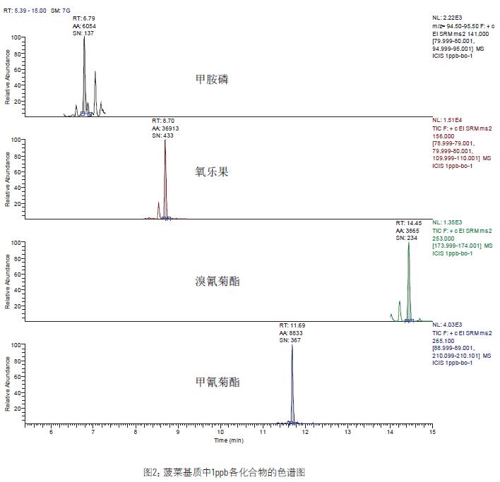 3.1.2菠菜基質(zhì)中1ppb各化合物的色譜圖如圖2所示: