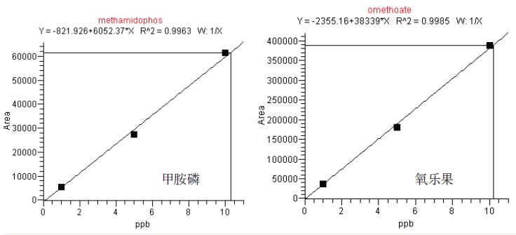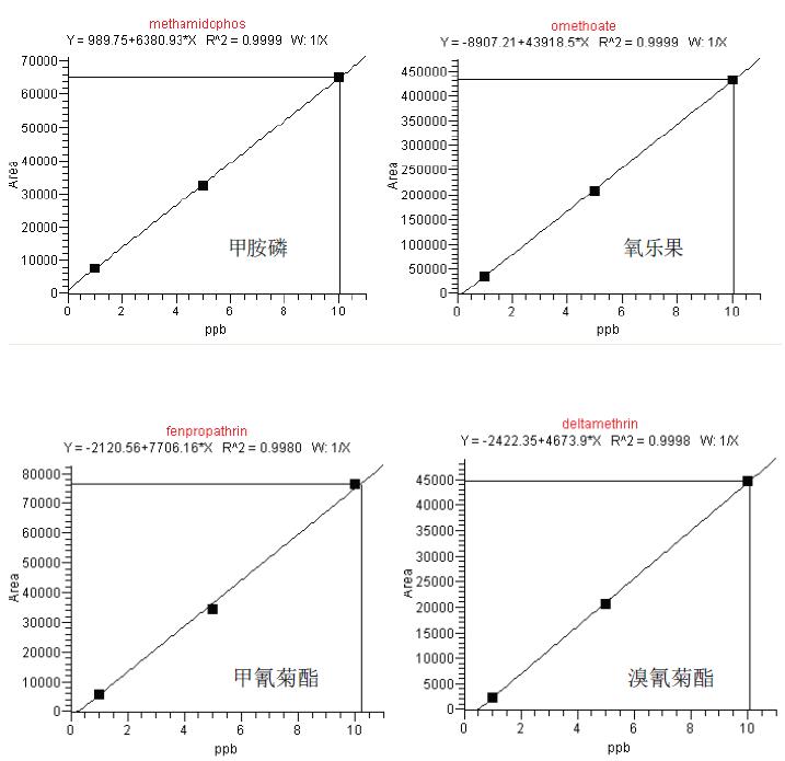 分別配置韭菜和菠菜基質(zhì)中這4種農(nóng)藥的梯度混合溶液,濃度分別為1ppb,5ppb和10ppb,建立標準曲線。這兩種基質(zhì)中每種農(nóng)藥的R2均大于0.995,表明線性良好。韭菜基質(zhì)中各化合物的標準曲線如圖3所示: