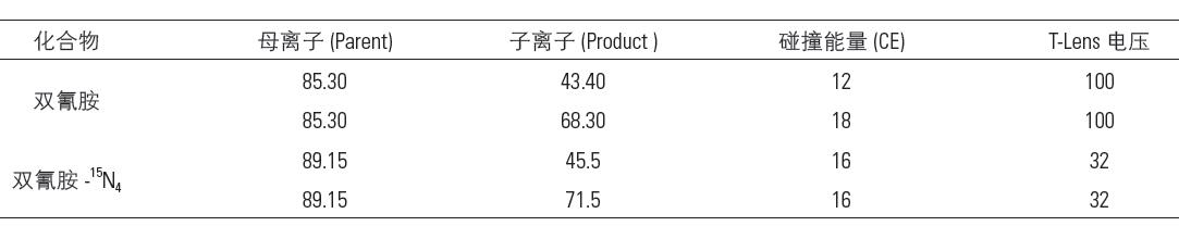 標(biāo)準(zhǔn)品:雙氰胺純度大于98%,內(nèi)標(biāo)雙氰胺-15N4 純度為95%。用乙腈溶解并配制成1.0 mg/mL 標(biāo)準(zhǔn)儲備液,再根據(jù)需要稀釋成適當(dāng)含量的混合標(biāo)準(zhǔn)工作液。其他試劑均為HPLC 色譜純。