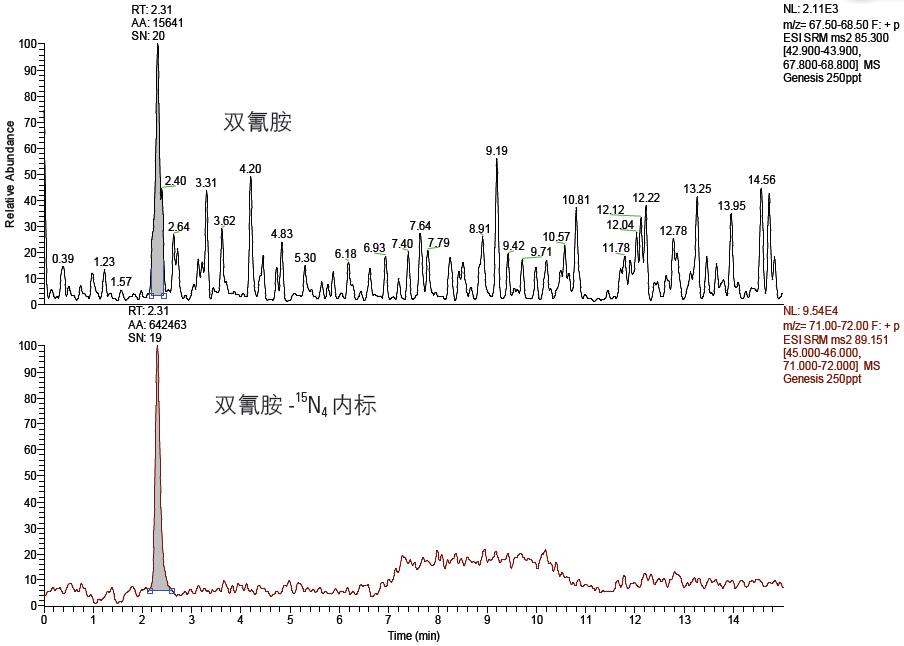 經(jīng)實(shí)驗(yàn)測定,雙氰胺的LOD 為0.25ng.mL-1,信噪比為20,提取離子流圖見圖1。