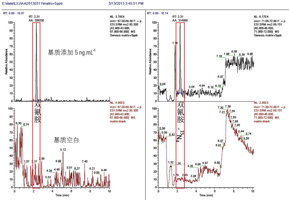 取某市售嬰幼兒奶粉試樣,進(jìn)行添加回收實(shí)驗(yàn)。奶粉的前處理方法如下:稱奶粉基質(zhì)樣品2.000g,加10mL 1% 的甲酸/ 水提取液,渦旋震蕩提取5min,超聲萃取10min;冷凍離心機(jī)6000R/min,離心10min,取上清液5mL 到小離心管中,14000R/min 離心10min,上清液全部過凈化柱(3cc,200mg/Hypercarb),控制流速1mL/min,用10mL 超純水清洗柱子;用甲醇/ 乙腈(4/6)洗脫,接取洗脫液氮?dú)獯蹈桑?0℃),用1mL(乙腈/ 水,9 : 1)定容,0.22 微米有機(jī)濾膜過濾,上機(jī)檢測。結(jié)果表明,空白基質(zhì)在雙氰胺及內(nèi)標(biāo)雙氰胺-15N4 的出峰位置沒有干擾,添加5ng.mL-1 的色譜圖如圖4,該圖中上方為基質(zhì)添加,下方為基質(zhì)空白。