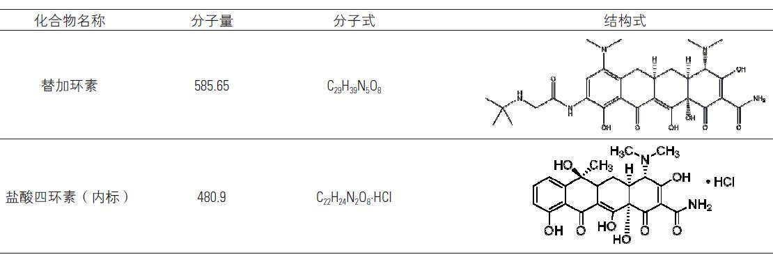 標(biāo)準(zhǔn)品:替加環(huán)素和內(nèi)標(biāo)鹽酸四環(huán)素純度均大于98%,信息見表1。用甲醇溶解并配制成1.0 mg/mL 標(biāo)準(zhǔn)儲備液,再根據(jù)需要稀釋成適當(dāng)濃度的混合標(biāo)準(zhǔn)工作液。其他試劑均為HPLC 色譜純。
