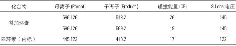 其中,替加環(huán)素選取m/z 513.2,四環(huán)素選取m/z 410.2 的離子作為定量離子。