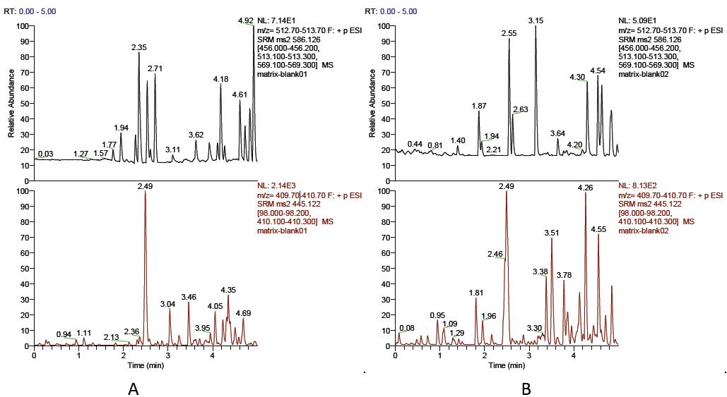 TSQ Vantage 三重四極桿串聯(lián)質(zhì)譜儀(賽默飛世爾科技Thermo Fisher Scientific 公司),配置有電噴霧電離源(ESI);Dionex Ultimate 3000 RSLC 超高壓液相色譜。