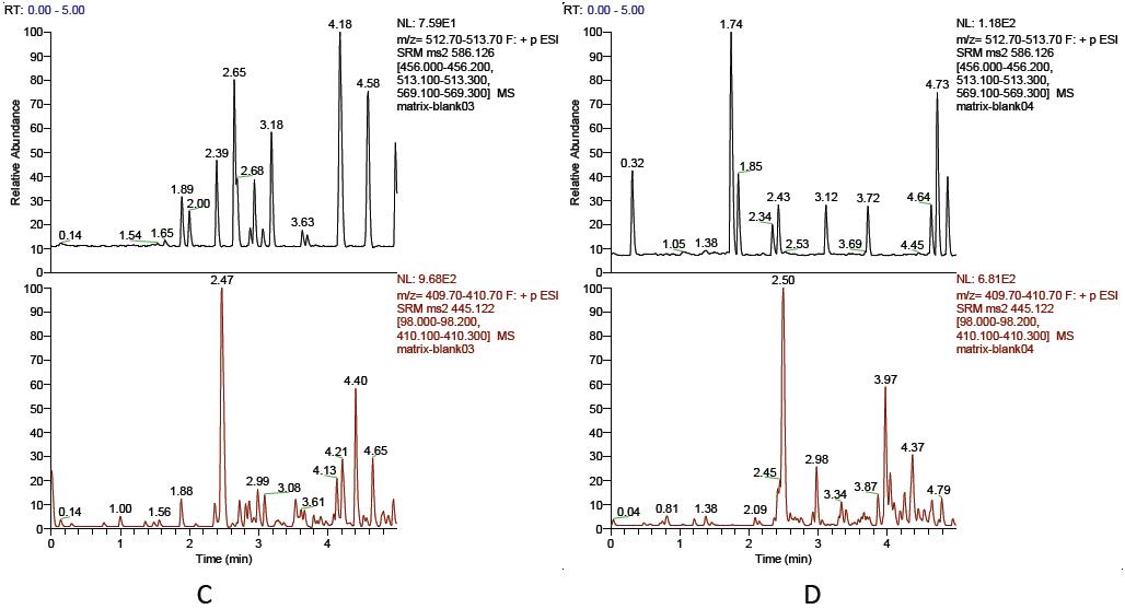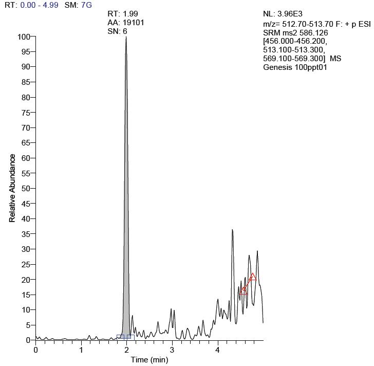 TSQ Vantage 三重四極桿液質(zhì)聯(lián)用系統(tǒng)檢測血漿中替加環(huán)素具有靈敏度高、特異性好的優(yōu)點,檢測限可以做到100ppb;該方法具有寬的線性范圍(5ppb-2000ppb),良好的精密度和準(zhǔn)確度;同時使用20% 的三氯乙酸沉淀蛋白的方法處理血漿樣品,簡單快捷,空白基質(zhì)沒有干擾,回收率可以達93.96%-105.63%,證明該方法檢測血漿中的替加環(huán)素具有很好的適用性。
