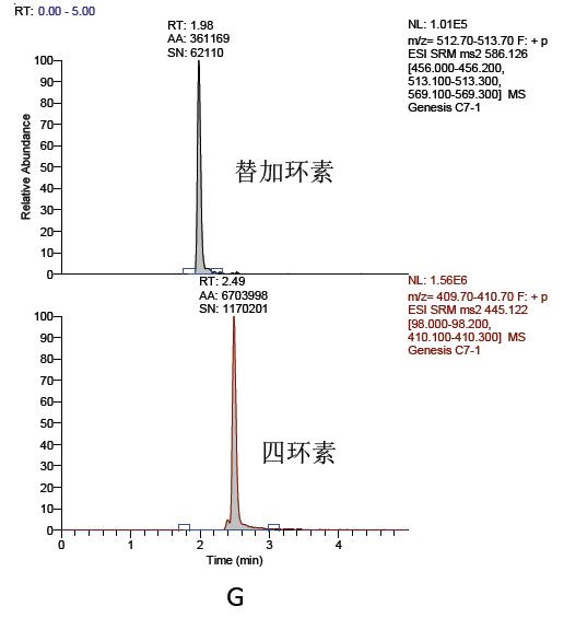 (G):空白血漿加入已知濃度替加環(huán)素和四環(huán)素的色譜圖