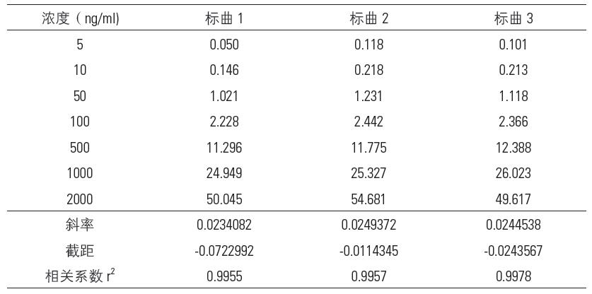 將1mg/mL 替加環(huán)素溶液逐級稀釋成一系列濃度,分別取10μL 加入到空白血漿中,配成0.2mL 的濃度分別為5,10,50,100,500,1000,2000ppb 的標(biāo)準(zhǔn)含藥血漿,按“血漿樣品處理”項下操作,記錄各標(biāo)準(zhǔn)點和內(nèi)標(biāo)的峰面積,以濃度為橫坐標(biāo),分析物與內(nèi)標(biāo)的峰面積比值為縱坐標(biāo),用加權(quán)最小二乘法進行回歸計算,求得直線回歸方程即為標(biāo)準(zhǔn)曲線,平行操作3 次,結(jié)果見表4,圖3。