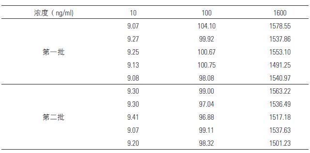 分別取不同量的替加環(huán)素加入到空白血漿中,配成0.2mL的濃度分別為10,100,1600ppb 的標(biāo)準(zhǔn)含藥血漿,按“血漿樣品處理”項下操作,在批內(nèi)和批間對每種濃度各做5份樣品,記錄色譜圖,計算濃度,求得批內(nèi)和批間精密度,結(jié)果見表5。