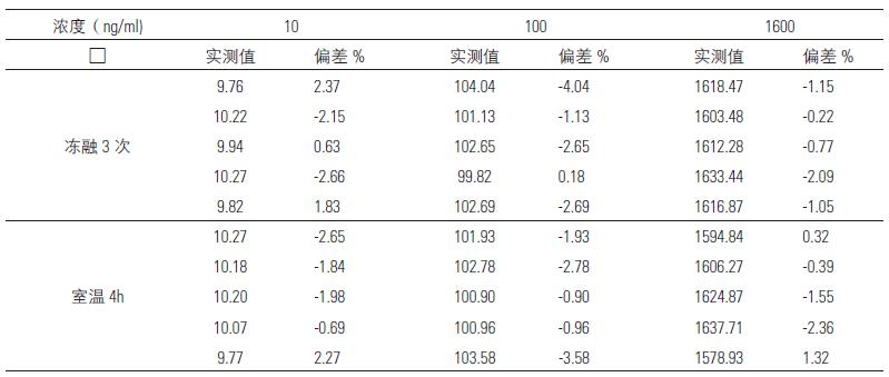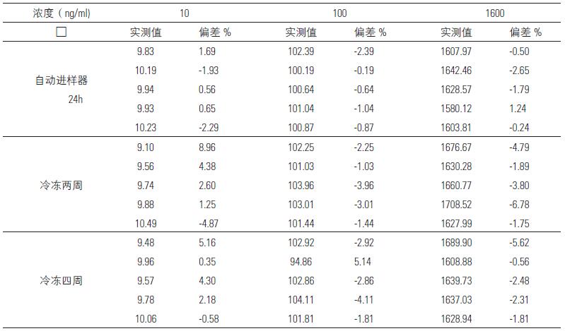 分別取不同量的替加環(huán)素加入到空白血漿中,配成0.2mL的濃度分別為10,100,1600ppb 的標(biāo)準(zhǔn)含藥血漿,按“血漿樣品處理”項下操作,對每種濃度各做25 份樣品,5份處理后在自動進樣器中放置24h;5 份在室溫放置4h 后按“血漿樣品處理”項下操作,進樣分析;5 份于配制好后-20℃冷凍后取出自然解凍,再冷凍再解融(反復(fù)凍融3 個循環(huán))后按“血漿樣品處理”項下進樣分析;5 份在-80℃冷凍兩周后按“血漿樣品處理”項下操作,進樣分析;5份在-80℃冷凍四周后按“血漿樣品處理”項下操作,進樣分析,結(jié)果見表7。