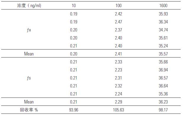 分別取不同量的替加環(huán)素加入到空白血漿中,配成0.2mL的濃度分別為10,100,1600ppb 的標(biāo)準(zhǔn)含藥血漿,按“血漿樣品處理”項下操作,記錄樣品峰面積與內(nèi)標(biāo)峰面積ƒx(ƒx=As'/Ai);10,100,1600ppb 樣品直接進樣后記錄峰面積與內(nèi)標(biāo)峰面積比值ƒs(ƒs=As/Ai), 計算ƒx 和ƒs 的比值即得到替加環(huán)素的回收率,平行操作5 次,結(jié)果見表8。