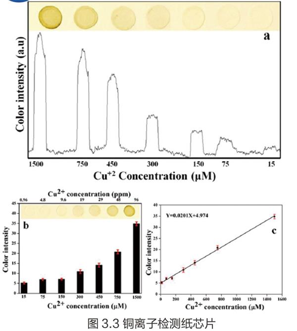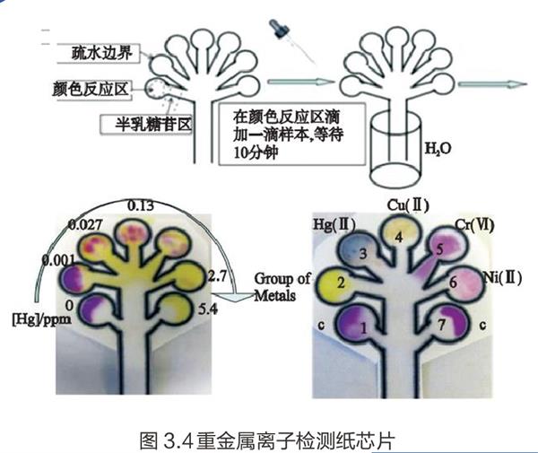 在檢測重金屬方面,一種基于固相生物活性的微流控紙芯片能夠在10min內(nèi)通過比色檢測以下各金屬的含量:汞(II)=0.001 mg/L;銀(I)=0.002 mg/L;銅(II)=0.020 mg/L;鎘(II)=0.020 mg/L;鉛(II)=0.140 mg/L;鉻(VI)=0.150 mg/L;鎳(II)=0.230 mg/L。