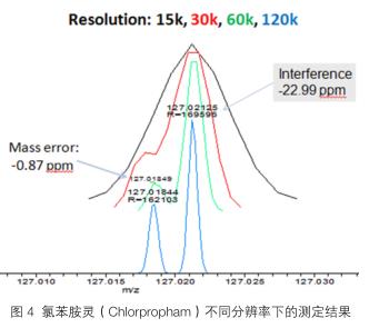 在有基質(zhì)干擾時,分辨率的高低會影響到精確質(zhì)量的測定。超高分辨率會提高儀器精確質(zhì)量數(shù)測定的準確性,可以對精確質(zhì)量極為接近的化合物進行有效鑒別。實驗中,分別在四種不同分辨率(15,000;30,000;60,000;120,000)下對化合物 10 µg/L 氯苯胺靈(Chlorpropham)碎片離子(m/127.01833)在大蔥樣品的測定結(jié)果,當分辨率低于 60,000時,離子與同重元素的干擾離子無法分開。因而在判斷上會發(fā)生假陰性或假陽性結(jié)果。只有當分辨率在60,000 及以上時,兩個同重元素離子可以明顯區(qū)分,并可以對氯苯胺靈快速判斷和準確定量,如圖4所示。