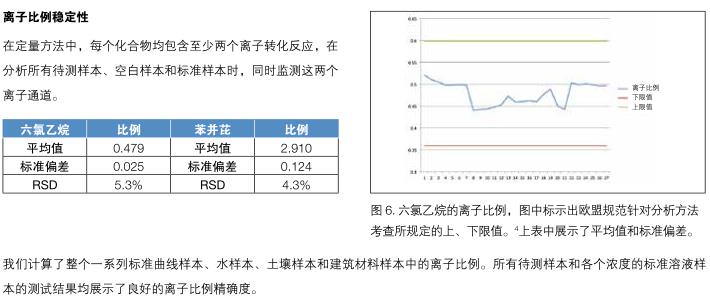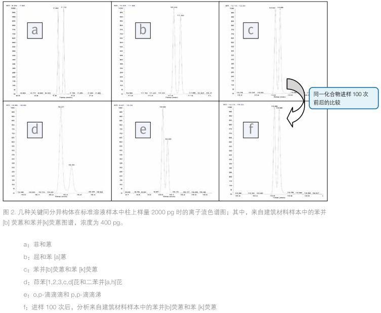所有待測(cè)化合物在 17 分鐘色譜分析時(shí)長(zhǎng)內(nèi)全部洗脫出峰。在進(jìn)樣測(cè)試超過(guò) 100 針?biāo)、土壤和建筑材料樣本后,色譜分離依然表現(xiàn)穩(wěn)定出色。