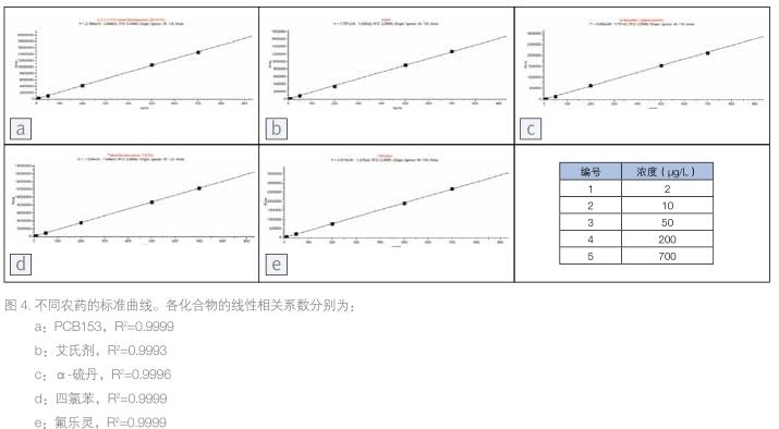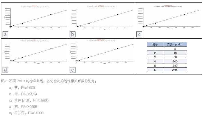 OCPs 和 PCBs 的標(biāo)準(zhǔn)曲線范圍為 2 µg/L 至 700 µg/L。而 PAHs 則需要更寬的定量范圍 2 µg/L 至 2500 µg/L。標(biāo)準(zhǔn)曲線未采用內(nèi)標(biāo)物質(zhì)校正。