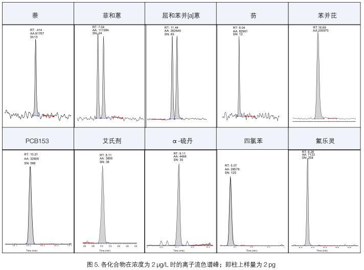 所有化合物在最低定量限(2 µg/L 或柱上樣量 2 pg)均響應(yīng)良好,信噪比值高。圖 5 為部分化合物在此濃度點(diǎn)的 SRM通道離子流色譜圖。