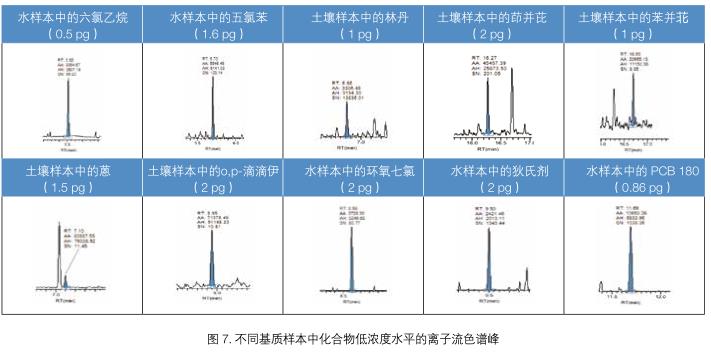 圖7 展示了一小部分化合物在低濃度基質(zhì)樣本中的離子流色譜峰,以展示測(cè)試方法的靈敏度和選擇性。