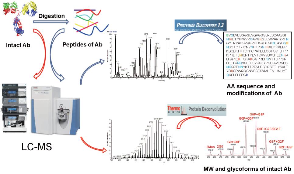Q-Exactive 串聯(lián)質(zhì)譜儀結(jié)合了高選擇性的四級桿質(zhì)譜檢測器和高分辨、高靈敏度的 OrbitrapTM 質(zhì)量分析器,大大提高了離子的選擇性、靈敏度和質(zhì)量精度。該系統(tǒng)具有 140,000 的分辨率(FWHM)、更高的靈敏度、更快的掃描速度和更大的動態(tài)范圍,同時結(jié)合了 HCD 碎裂技術(shù),可以實現(xiàn)串級質(zhì)譜碎裂和鑒定,為深度復(fù)雜樣品分析,包括蛋白質(zhì)組學(xué)、代謝組學(xué)、脂類組學(xué)等樣品的鑒定,翻譯后修飾和定量分析,提供了全面、高效和快速的質(zhì)譜分析平臺。同樣,Q-Exactive 質(zhì)譜可以有效地應(yīng)用到 ADC 單抗藥物的研發(fā)和生產(chǎn)監(jiān)控中,基本的實驗分析流程如下所示。