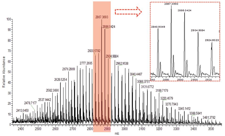 圖 3. ADC 抗體藥物原始質(zhì)譜圖(紅色虛線框內(nèi)為中間幾組峰的放大圖)