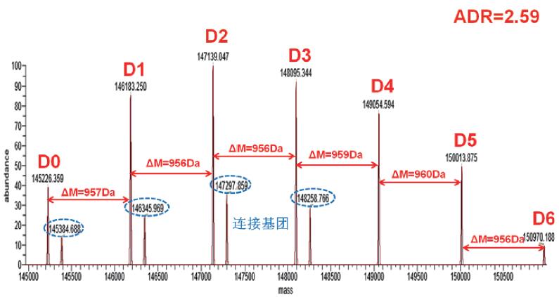 (D0–D6 表示不同 ADC 藥物小分子結(jié)合的單抗變體,藍色圓圈表示連接基團對應(yīng)的質(zhì)譜峰。)