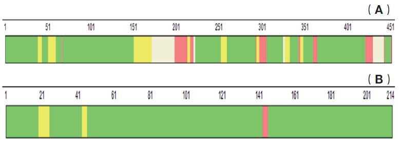 圖6. ADC 抗體藥物經(jīng)過 trypsin 酶解和 Q-Exactive 質(zhì)譜實現(xiàn)的氨基酸序列覆蓋度示意圖。(A 為重鏈氨基酸序列覆蓋示意圖,B 為輕鏈氨基酸序列覆蓋示意圖,其中綠色標記的氨基酸序列表示該段序列鑒定的可靠性非常高,達到 99% 以上,紅色標記的氨基酸序列表示該段序列鑒定的可靠性為 95% 以下,無顏色標記的氨基酸序列表示該段序列沒有被鑒定到,氨基酸序列上方的數(shù)字代表氨基酸的位置。)