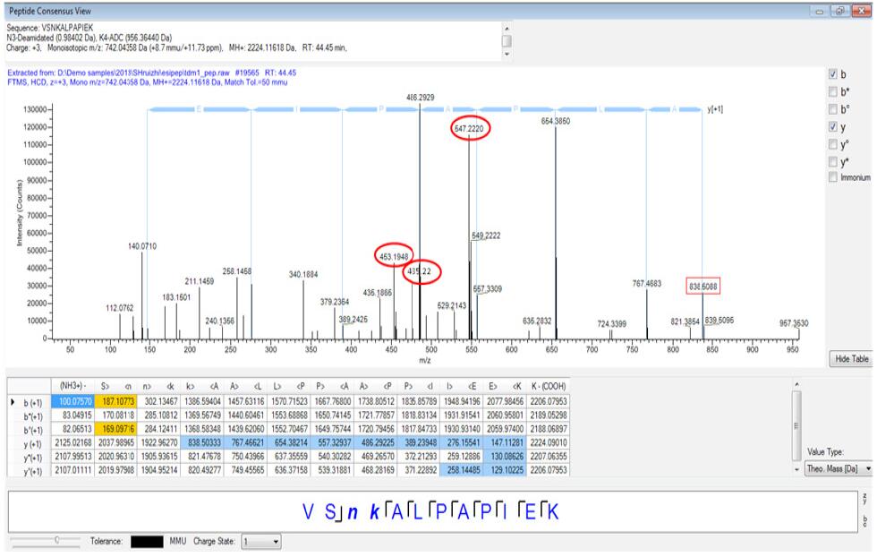 圖 9. ADC 結(jié)合肽段 VSNKALPAPIEK 的串級質(zhì)譜圖