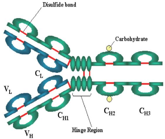 圖 1. 單抗藥物的簡(jiǎn)單結(jié)構(gòu)示意圖(V 表示可變區(qū)域,C 表示恒定區(qū)域,L 表示輕鏈,H 表示重鏈。)