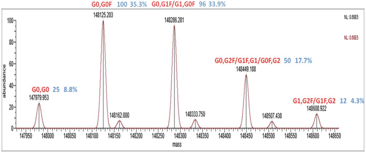 圖 3. LTQ-Orbitrap Elite 質(zhì)譜采集的單抗原始質(zhì)譜圖經(jīng)過 Protein Deconvolution 2.0 軟件去卷積處理之后的單抗分子質(zhì)量分布圖(G0、G0F、G1F 和 G2F 表示不同類型的糖型,藍(lán)色數(shù)字表示質(zhì)譜峰所對(duì)應(yīng)的峰強(qiáng)度和相對(duì)定量信息。)