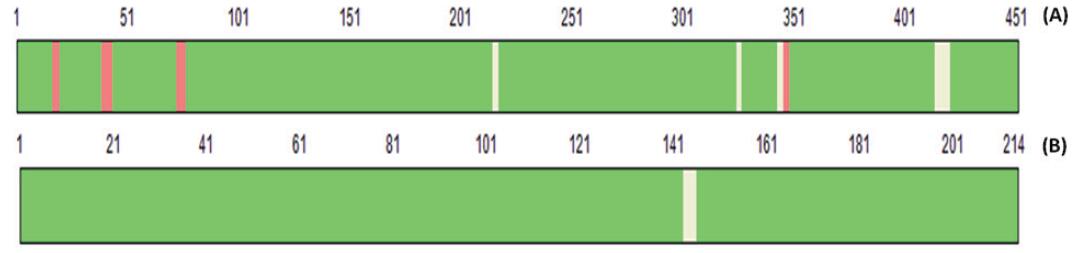 圖 4. 單抗經(jīng)過 trypsin 酶解和 LTQ-Orbitrap Elite 質(zhì)譜實(shí)現(xiàn)的氨基酸序列覆蓋度示意圖(A為重鏈氨基酸序列覆蓋示意圖,B 為輕鏈氨基酸序列覆蓋示意圖,其中綠色標(biāo)記的氨基酸序列表示該段序列鑒定的可靠性非常高,達(dá)到 99% 以上,紅色標(biāo)記的氨基酸序列表示該段序列鑒定的可靠性為 95% 以下,無顏色標(biāo)記的氨基酸序列表示該段序列沒有被鑒定到,氨基酸序列上方的數(shù)字代表氨基酸的位置。)