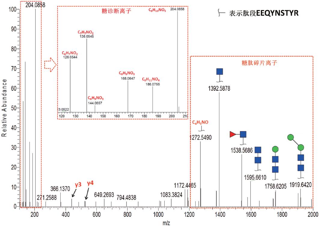 圖 5. LTQ-Orbitrap Elite 質(zhì)譜采集的 EEQYN(G0F)STYR 糖肽的二級(jí)質(zhì)譜圖(紅三角表示巖藻糖;藍(lán)方塊表示 N-乙酰氨基葡萄糖;綠圓表示甘露糖)