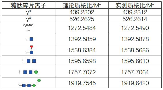 表 6. EEQYN(G0F)STYR 糖肽經(jīng)過 LTQ-Orbitrap Elite 質(zhì)譜鑒定到的糖肽碎片離子列表(紅三角表示巖藻糖;藍(lán)方塊表示N-乙酰氨基葡萄糖;綠圓表示甘露糖)