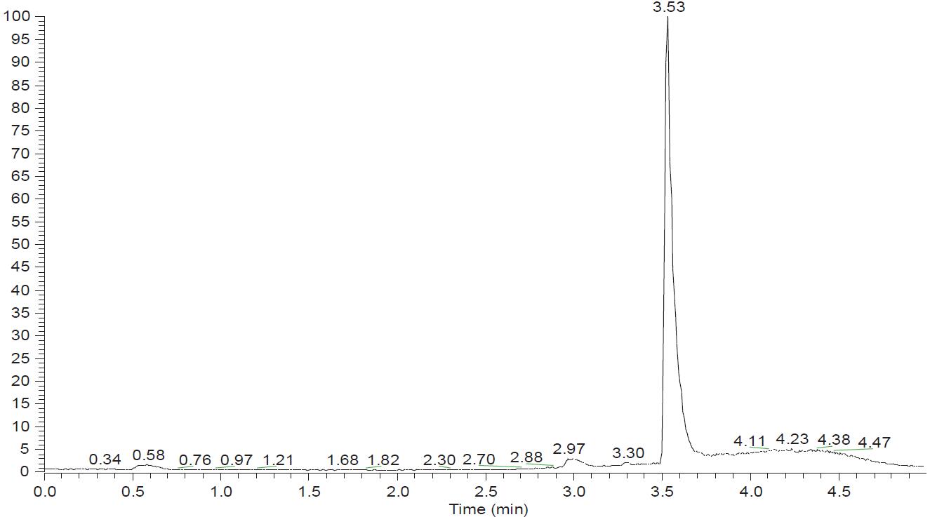 采用 5 min 的梯度分析,離子阱采集數(shù)據(jù),寡聚核酸主要在 3.53 min 出峰。