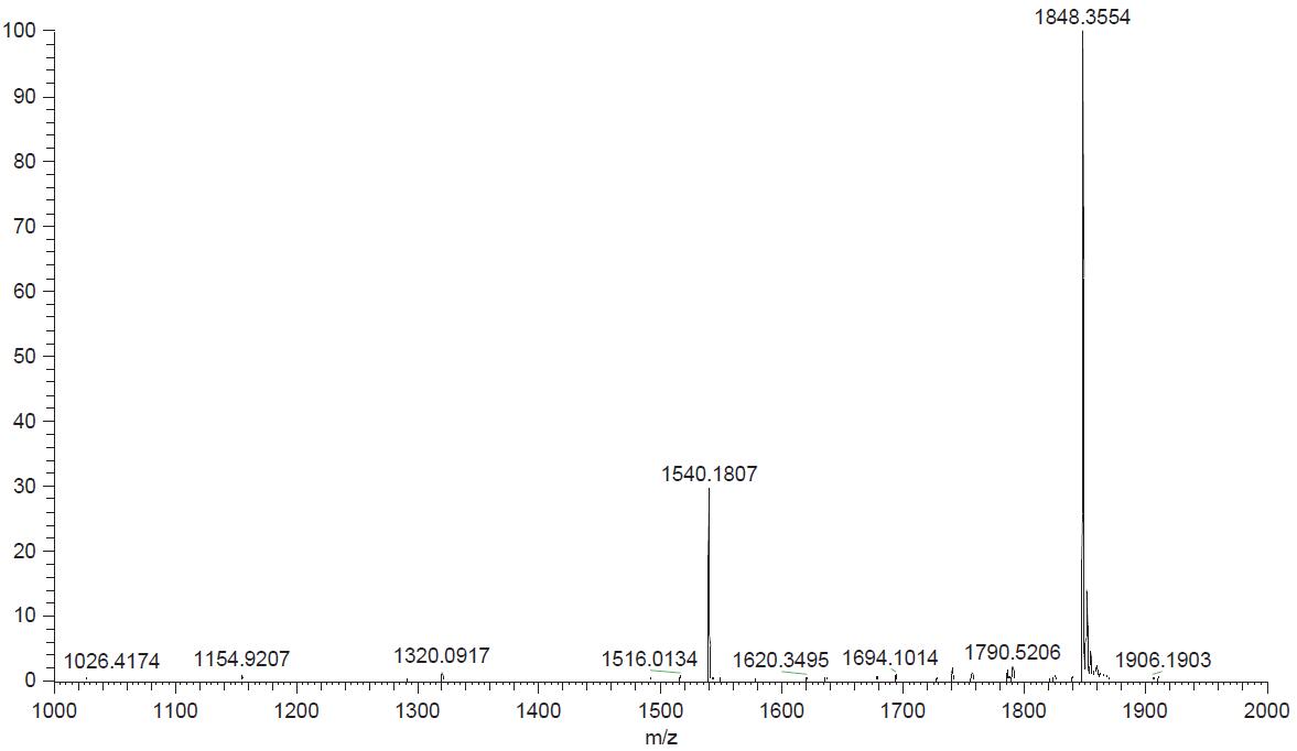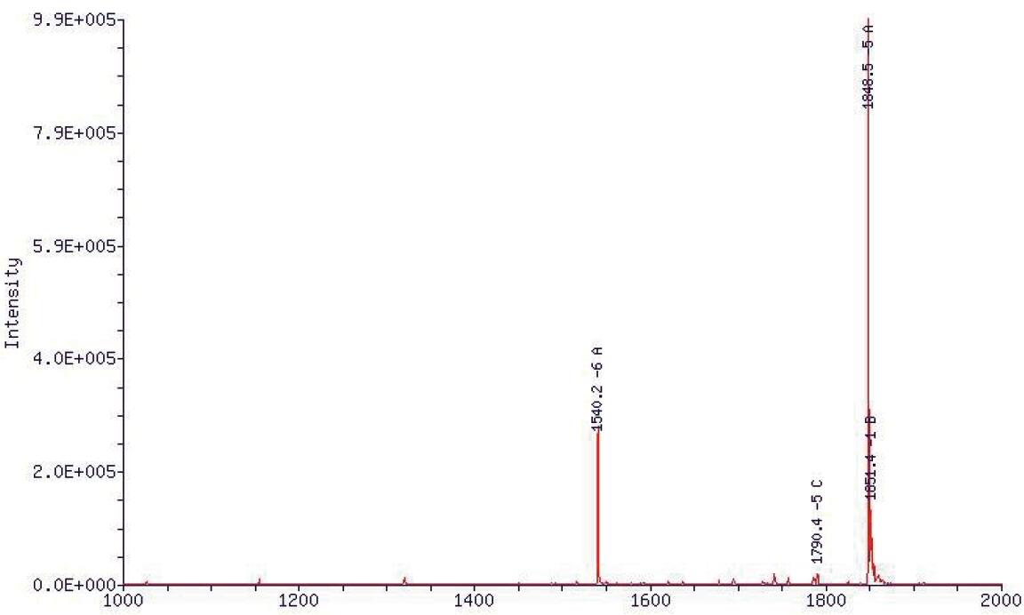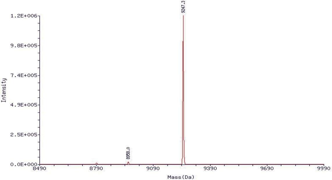 通過 ProMass 軟件去卷積之后的平均分子質(zhì)量為 9247.3,與理論的平均分子質(zhì)量完全一致,并且 ProMass 軟件對原始質(zhì)譜圖中質(zhì)譜峰的電荷進(jìn)行了歸屬,如下所示,質(zhì)荷比為 1540.2 的質(zhì)譜峰對應(yīng)的電荷為 –6 價(jià),質(zhì)荷比為 1848.5 的質(zhì)譜峰對應(yīng)的電荷為–5 價(jià)。