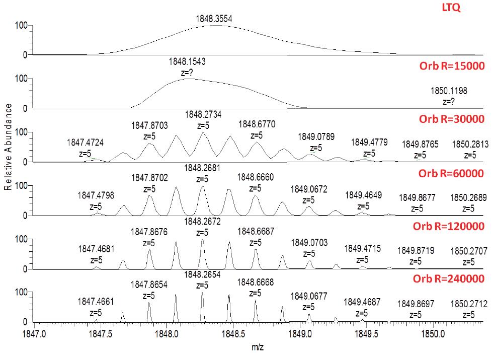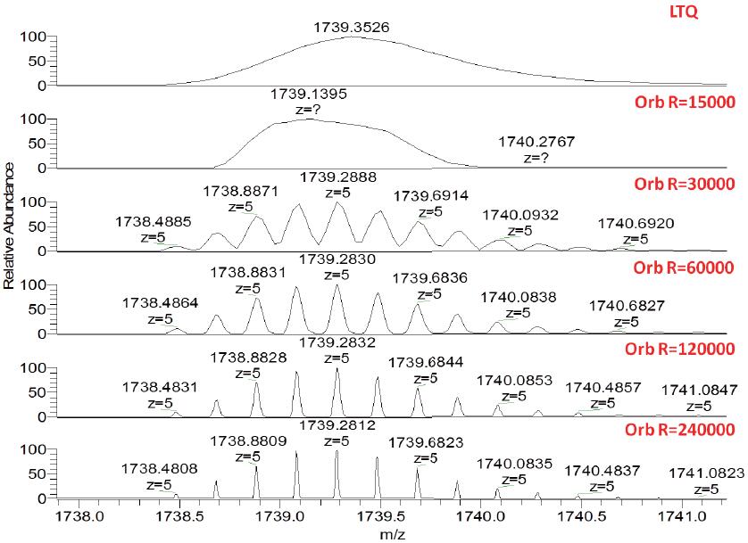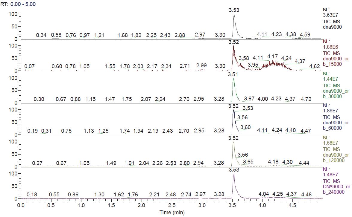 與低分辨的實(shí)驗(yàn)相比,在保持上樣量和色譜條件不變的前提下,僅僅改變質(zhì)譜采集的分辨率,可以看到寡聚核苷酸的色譜保留時(shí)間不變,基本在 3.52 min 出峰,不過隨著質(zhì)譜檢測器分辨率的提高,原始質(zhì)譜圖發(fā)生了顯著的變化,如下所示,當(dāng)使用線性離子阱 LTQ 作為質(zhì)量檢測器時(shí),只檢測到一個(gè)大包峰,無法分辨電荷;當(dāng)使用 Orbitrap 作為質(zhì)量檢測器,分辨率 R 設(shè)置為 15000 時(shí),同樣也只檢測到一個(gè)大包峰,電荷仍然無法分辨;當(dāng)使用 Orbitrap 作為質(zhì)量檢測器,分辨率 R 設(shè)置為 30,000 時(shí),可以觀察到一些同位素峰,電荷可以實(shí)現(xiàn)分辨;當(dāng)使用 Orbitrap 作為質(zhì)量檢測器,分辨率 R 設(shè)置為 60,000 時(shí),可以觀察到稍微好一些的同位素峰,但無法完全分離,電荷同樣可以實(shí)現(xiàn)分辨;當(dāng)使用 Orbitrap 作為質(zhì)量檢測器,分辨率 R 設(shè)置為 120,000 時(shí),同位素峰可以實(shí)現(xiàn)完全分離,電荷同樣也可以實(shí)現(xiàn)分辨;當(dāng)使用 Orbitrap 作為質(zhì)量檢測器,分辨率 R 設(shè)置為 240,000 時(shí),同位素峰可以實(shí)現(xiàn)完全分離,并且峰形更加尖銳,電荷同樣也可以實(shí)現(xiàn)分辨,由此我們可以準(zhǔn)確的計(jì)算得到寡聚核苷酸的單同位素質(zhì)量和平均質(zhì)量,最后的實(shí)驗(yàn)結(jié)果與理論預(yù)測的分子質(zhì)量保持完全一致。