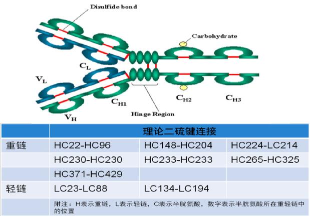 圖 1. IgG1 類型單抗藥物的二硫鍵連接形式以及正在測試的單抗藥物的理論二硫鍵的具體連接信息。