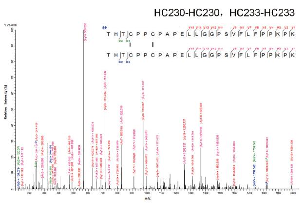 最后,以重鏈鉸鏈區(qū)的兩對相近的二硫鍵 HC230-HC230和 HC233-HC233 為例,如圖 4 所示,肽段 THTCPPCPAPELLGGPSVFLFPPKPK 和 THTCPPCPAPELLGGPSVFLFPPKPK 的二級碎片信息也非常豐富,同時一級母離子的質(zhì)量偏差在 1.70 ppm,因此可以準(zhǔn)確、快速的確定這兩對二硫鍵的連接情況。