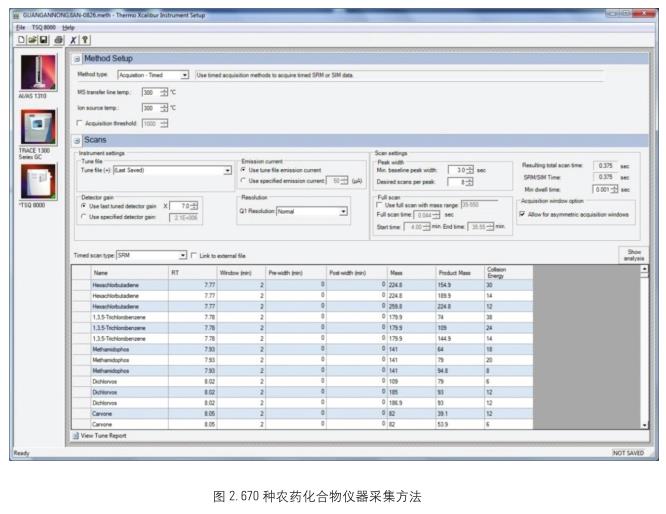 農(nóng)藥殘留方法包中包含了 670 種農(nóng)藥化合物優(yōu)化后的相關(guān)信息,包括離子對(duì)(母離子和子離子)、碰撞能量、掃描時(shí)間、駐留時(shí)間及監(jiān)測(cè)反應(yīng)離子的數(shù)目等一系列質(zhì)譜參數(shù)。利用 TSQ8000Evo 氣質(zhì)聯(lián)用儀的高速掃描,采用特有的 Timed -SRM 模式,快速建立儀器采集方法,如圖 1,圖 2 所示。