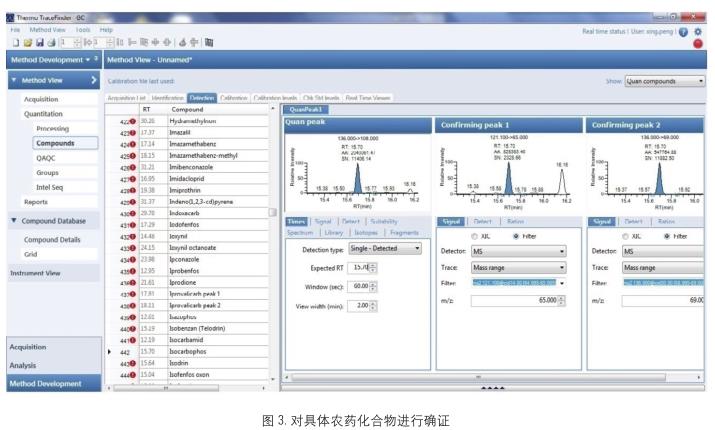 Trace Finder 軟件結(jié)合農(nóng)藥殘留方法包可直接、快速建立數(shù)據(jù)處理方法。對(duì)采集樣品的數(shù)據(jù)進(jìn)行快速處理,確定所含農(nóng)藥的具體種類以及相應(yīng)的保留時(shí)間。如圖 3 所示。