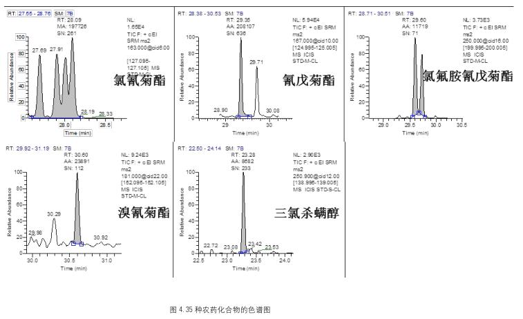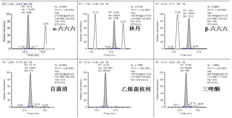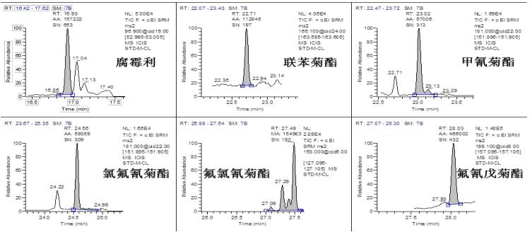 有機(jī)磷、有機(jī)氯、擬除蟲菊酯類農(nóng)藥是常用農(nóng)藥,包括多種高毒、劇毒農(nóng)藥及我國禁用農(nóng)藥。我國已頒布了 GBNY/T 761-2008《蔬菜和水果中有機(jī)磷、有機(jī)氯、擬除蟲菊酯和氨基甲酸酯類農(nóng)藥多殘留的測(cè)定》 [4] 的檢測(cè)方法。本實(shí)驗(yàn)參照此標(biāo)準(zhǔn)進(jìn)行,采用賽默飛世爾科技全新一代三重四極桿氣相色譜質(zhì)譜聯(lián)用儀(TSQ 8000Evo)結(jié)合對(duì)應(yīng)的農(nóng)藥殘留篩查方法包(670 種化合物質(zhì)譜信息),對(duì)樣品中含有的有機(jī)磷、有機(jī)氯、擬除蟲菊酯類農(nóng)藥殘留進(jìn)行篩查,進(jìn)而對(duì)其中含有的相應(yīng)農(nóng)藥進(jìn)行確證和定量。
