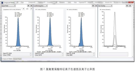按照歐盟方法指令[5] ,質(zhì)譜方法的確證要求必須達(dá)到 4個(gè)定性點(diǎn),表 2 及表 3 列出了具體判定標(biāo)準(zhǔn)及常見檢測(cè)方式的定性點(diǎn)數(shù)量要求。對(duì)于 GC-MS/MS,3對(duì)離子對(duì)的定性點(diǎn)有 5-6 個(gè),完全達(dá)到了相關(guān)方法的要求。因此,實(shí)現(xiàn)了良好的定性效果。圖 5,圖 6,圖 7 為樣品中農(nóng)藥丙溴磷、林丹及氯氟氰菊酯特征離子色譜圖及離子比率圖。