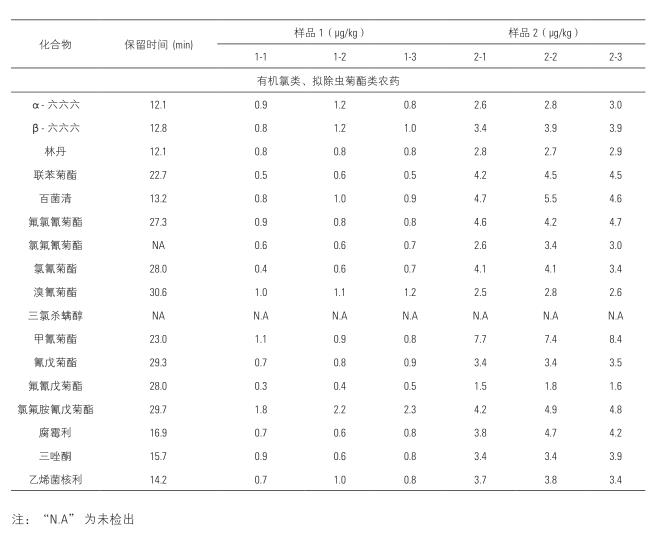 首先應(yīng)用上述建立好的快速篩查方法,對(duì)基質(zhì)添加標(biāo)準(zhǔn)品有機(jī)磷 ( 濃度 8 μg/kg),有機(jī)氯、擬除蟲菊酯類 ( 濃度 10μg/kg)進(jìn)行數(shù)據(jù)采集,使用 Trace Finder 進(jìn)行數(shù)據(jù)處理,確定了 18 種有機(jī)磷農(nóng)藥及 17 種有機(jī)氯、擬除蟲菊酯類農(nóng)藥離子對(duì)信息,如表 1 所示。根據(jù)確認(rèn)的農(nóng)藥信息優(yōu)化儀器采集方法,對(duì)實(shí)際樣品進(jìn)行定量檢測(cè)分析,以基質(zhì)標(biāo)準(zhǔn)樣品建立標(biāo)準(zhǔn)曲線,同時(shí)對(duì)其他樣品進(jìn)行定量。檢測(cè)的實(shí)際樣品共 12 個(gè)(依照標(biāo)準(zhǔn),有機(jī)磷、有機(jī)氯及擬除蟲菊酯類農(nóng)藥分別進(jìn)行樣品前處理。每個(gè)樣品有 2 個(gè)濃度,每個(gè)濃度 3 個(gè)平行樣品。)。