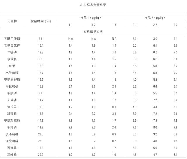 Trace Finder 軟件可以在確定農(nóng)藥種類的同時(shí)對(duì)樣品中含有的農(nóng)藥殘留進(jìn)行準(zhǔn)確定量。使用基質(zhì)標(biāo)準(zhǔn)建立標(biāo)準(zhǔn)曲線,對(duì)樣品中的農(nóng)藥殘留進(jìn)行定量。結(jié)果發(fā)現(xiàn),針對(duì)特定化合物儀器的定量水平達(dá)到 1 μg/kg 以下,完全滿足日常農(nóng)藥殘留檢測(cè)的要求(10 μg/kg),并且在低濃度時(shí)也能獲得良好的譜圖效果和穩(wěn)定的重復(fù)性。實(shí)際樣品檢測(cè)到的各目標(biāo)物農(nóng)藥濃度如表 4 所示。