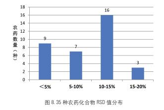 將2個(gè)基質(zhì)標(biāo)準(zhǔn)樣品各連續(xù)進(jìn)樣10次,計(jì)算每個(gè)目標(biāo)物濃度的相對(duì)標(biāo)準(zhǔn)偏差(RSD),測(cè)試儀器的穩(wěn)定性,如圖 8 所示。結(jié)果顯示,所有農(nóng)藥化合物 RSD 均在 20%以下。35 種農(nóng)藥化合物 RSD< 15%,占總數(shù)的 91.4%。儀器在低濃度水平(≤ 10 μg/kg)連續(xù)進(jìn)樣的結(jié)果顯示,儀器穩(wěn)定性良好,滿足檢測(cè)需求。